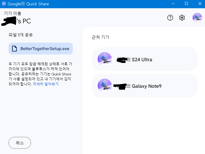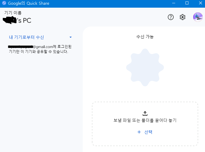 - PC에서 Windows용 Quick Share를 실행하고 아래의 화면이 나온다.