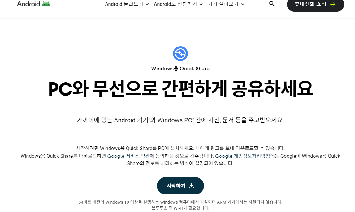 - Windows용 Quick Share는 64비트 버전의 Windows 10 이상을 실행하는 Windows 컴퓨터에서 지원되며 ARM 기기에서는 지원되지 않는다. 블루투스 및 Wi-Fi가 필요하다.