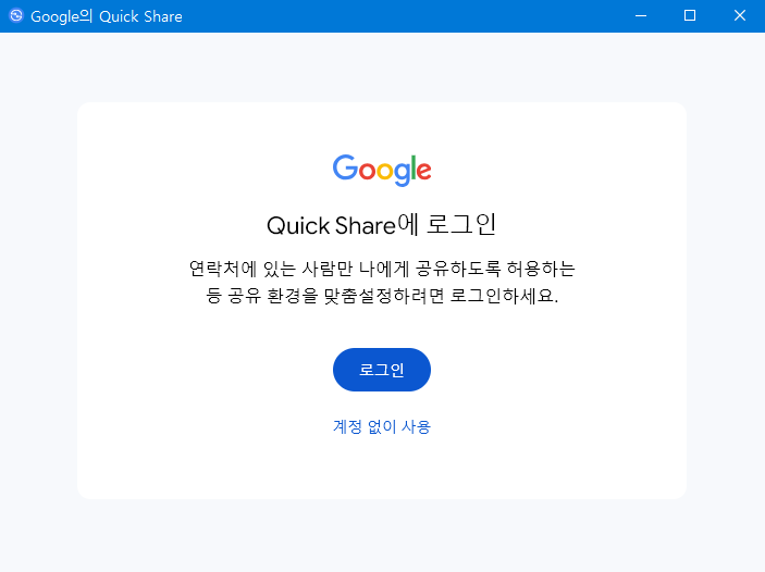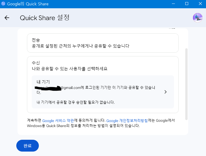 - 아래와 같이 자신의 Google 계정에 로그인하고 Quick Share를 설정을 완료한다.