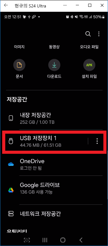 - 아래와 같이 스마트폰 "내 파일" 앱에 "USB 저장장치1" 가 보인다. 이를 터치하면 저장장치 내의 파일이나 폴더 등이 보인다.